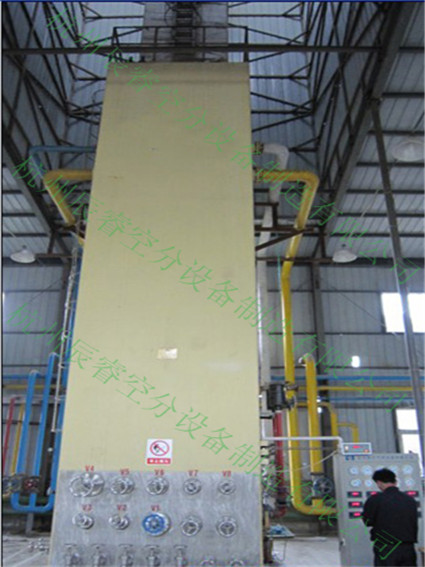 小型深冷空分設備采用低壓流程,利用深度冷凍及精餾的方法從空氣中提取純氧和純氮,即利用透平膨脹機冷凍循環原理使空氣液化,根據液氧和液氮的沸點不同,在分餾塔內進行二次精餾,從而獲得99.6%純度的氧氣及99.99%以上純度的氮氣。根據需要,改變操作亦可制取部分液氧、液氮和醫用氧。